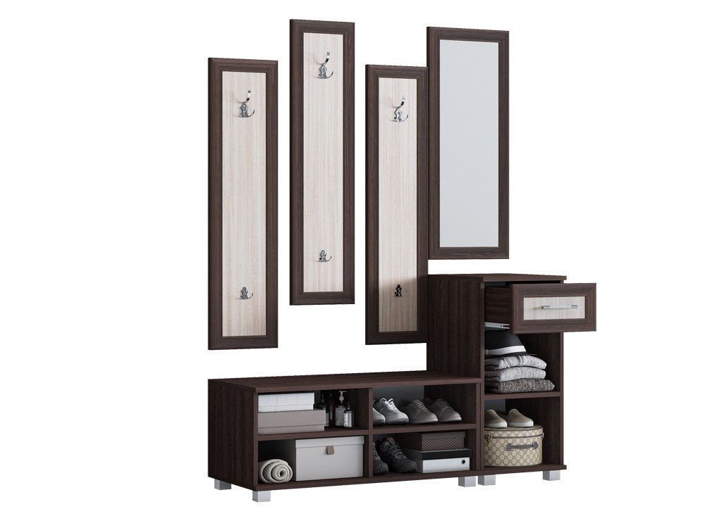 Прихожая Вавилон-3 ЛДСП (раскладка МДФ) — недорогое и рациональное решение в стиле минимализм. Три панели вешалок, зеркало и две тумбы. Цветовое решение традиционно — контраст светлых и темных тонов. В нише с закрытыми шкафчиками присутствуют полки.